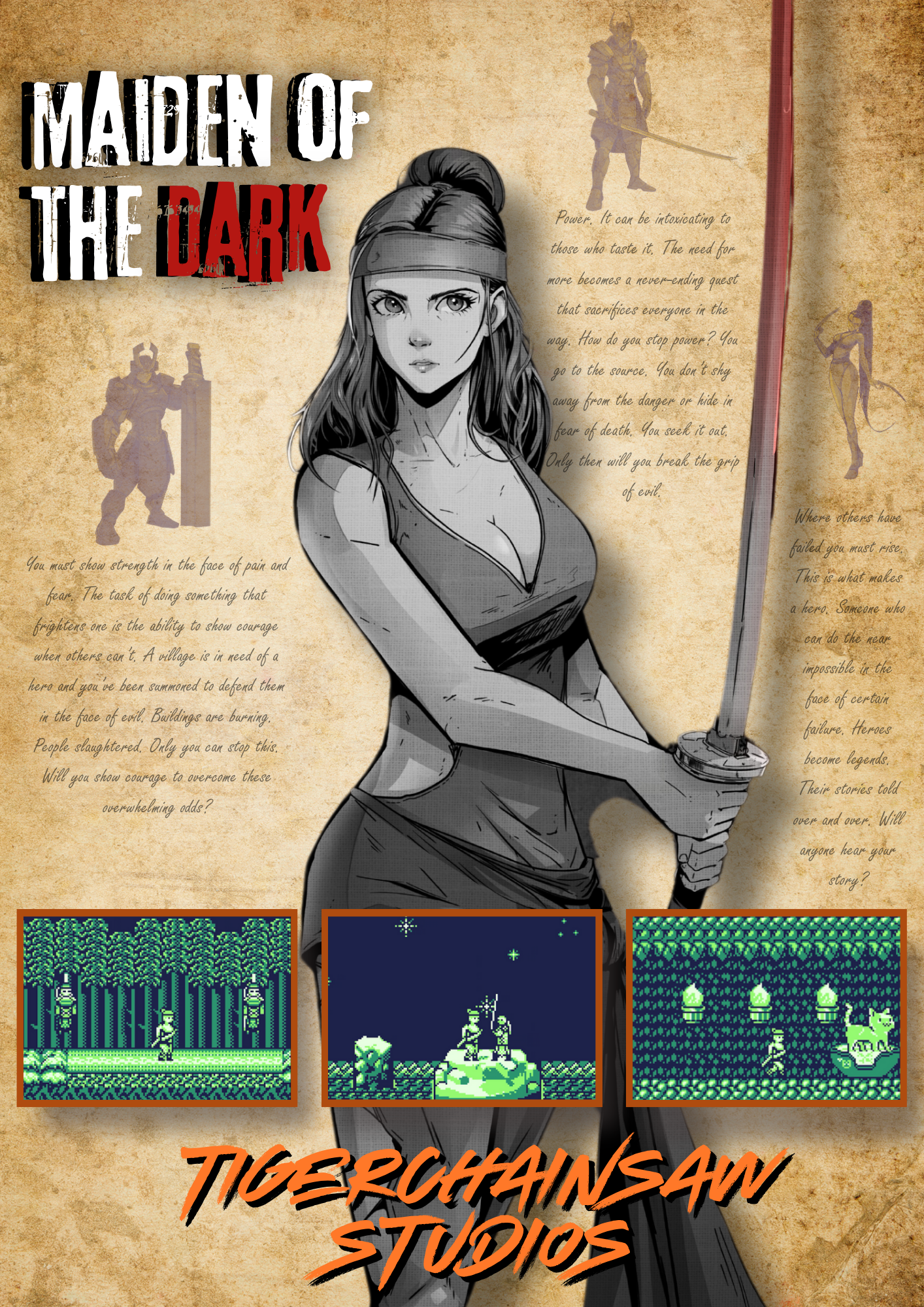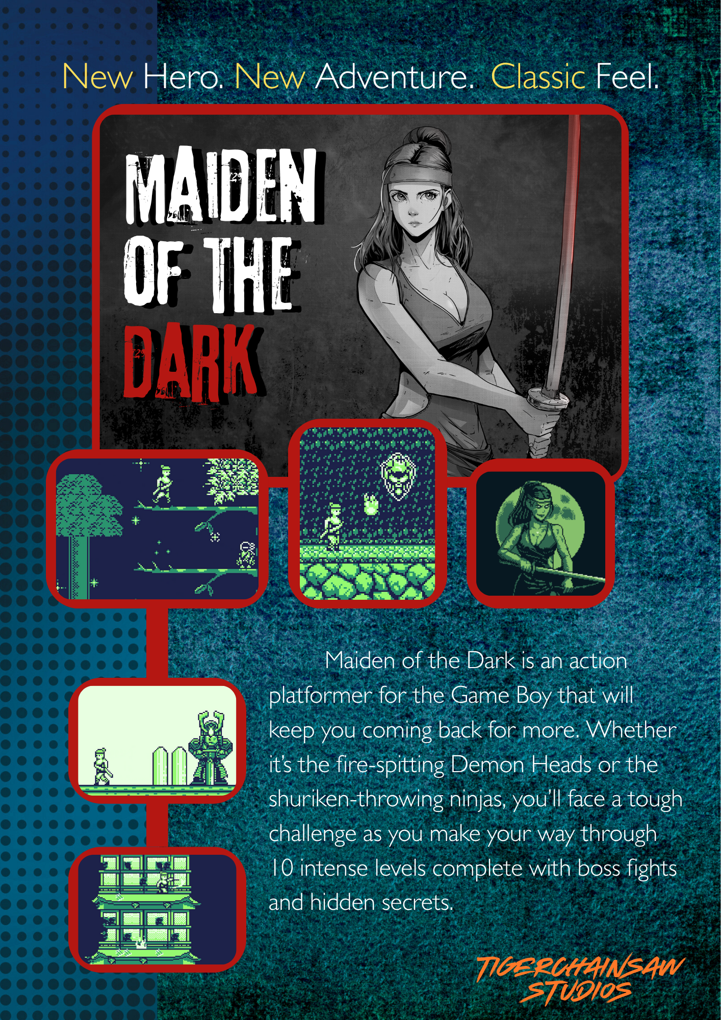 Maiden of the Dark is a 2025 action-platformer developed and published by TigerChainsaw Studios. This new Gameboy game is perfect for those who want to relive their nostalgia on their favorite handheld system. Compatible with the Game Boy, Game Boy Pocket, Game Boy Color, Game Boy Advance, Game Boy Advance SP, and new handheld devices like the Analog Pocket. You will receive a physical cartridge of the game, a manual, and a game box.